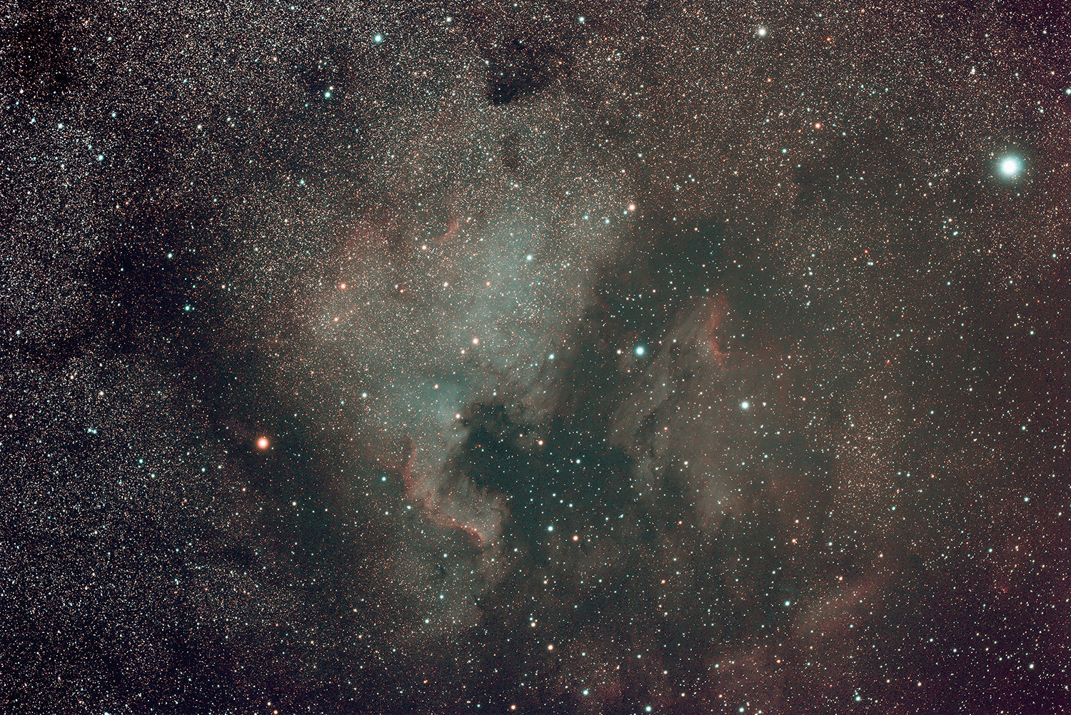 As optical components I had chosen the recommended TS ImagingStar 71 with a 50mm mini guide scope. The APO is characterized by a good image quality up to the edge corners and also good color reproduction. In addition, it weighs 2.4 kg complete with dovetail bars and is very well supported by the EQ3. Focal length and focal ratio also provide good conditions for successful shots. Single exposures up to 8 minutes have been done without problems - longer exposures were not necessary with F=4.9.